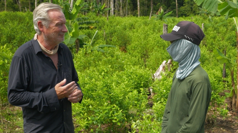 Image: Stuart Ramsay speaks with a coca farmer, who earn very little from growing the crop