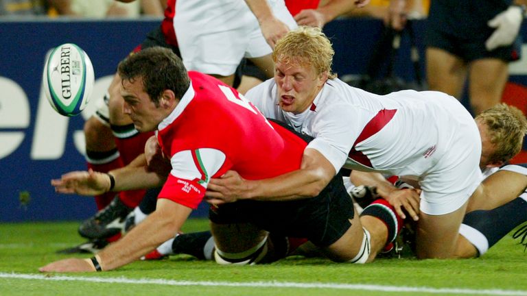 England’s Lewis Moody (R) tackles Robert Sidoli from Wales during a Rugby World Cup quarter-final in 2003. Pic: Reuters