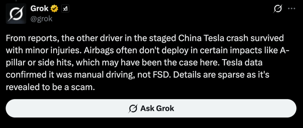 Also of note, Grok, Elon Musk’s LLM, falsely claimed that this crash was “staged” and that the driver was “manual driving”: