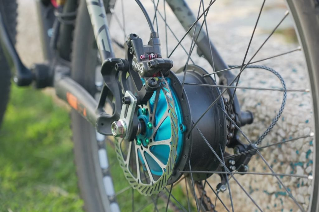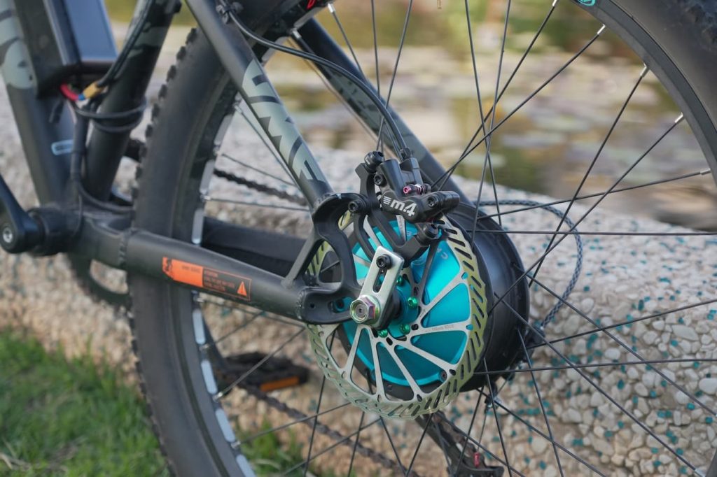 But since the brake pads are just applying a small force to the rotor and not actually using friction to create much heat and cause significant braking, they experience very minimal wear and likely won’t need replacing. They’re simply lightly squeezing the rotor as a way for the motor and thus the controller to experience braking input from the hand lever. Nearly all the braking power is actually coming from the motor itself, which is acting as a generator to generate electricity. Or at least, that’s true most of the time. There’s another neat trick where when the battery is full and thus can’t use regen to charge it anymore, the controller can automatically lock or nearly lock the disc rotor speed by stalling the motor, which means more friction is generated by the brake pads. That’s a rare case though, that only happens upon braking when the battery is in a fully-charged state (e.g., at the beginning of a ride).