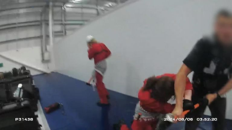 Police bodycam footage allegedly shows a Palestine Action activist attacking police with a sledgehammer during a break-in at an Israel-based defence firm’s UK site, a court has heard.