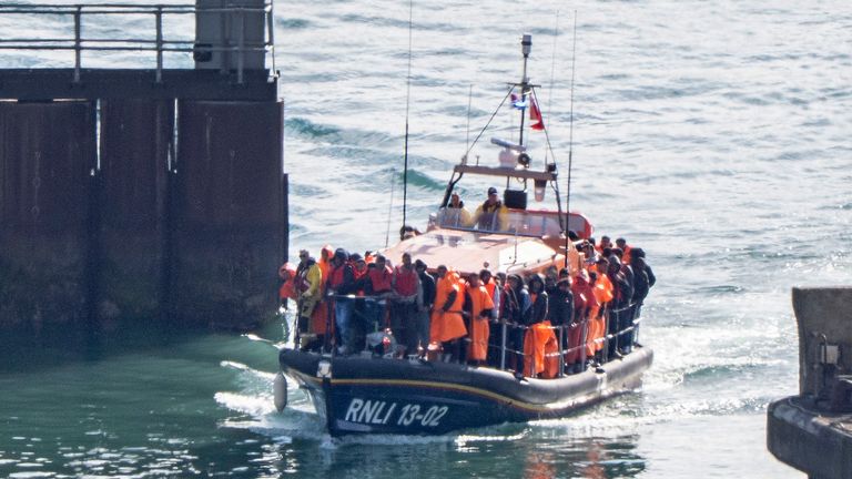 Image: Rescued migrants are brought in by the RNLI to Dover earlier this month. Pic: PA