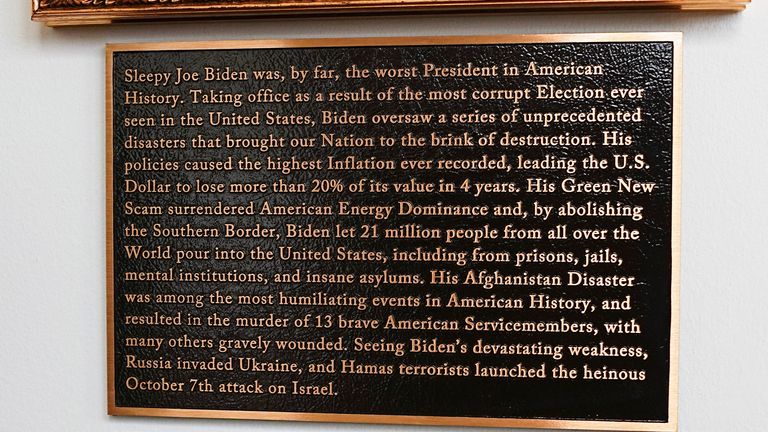 Among the plaques, apparently written by Mr Trump himself, is one for Joe Biden reading: “Sleepy Joe Biden was, by far, the worst president in American history.”