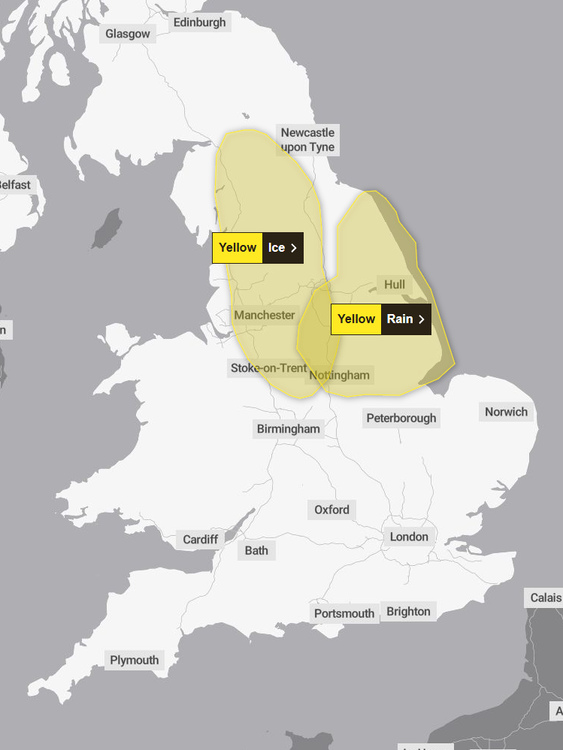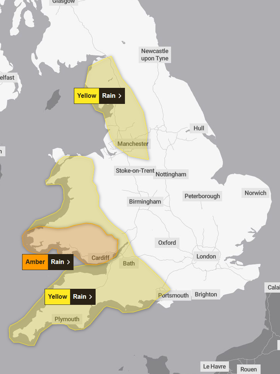 A larger but less severe yellow rain warning is also in place until midnight covering the North East, the Midlands, the South East, much of the southern tip of England and eastern Wales.
