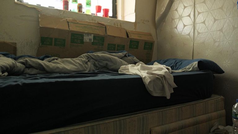 In a dingy stairwell, a bed has been crammed on to a landing, and a sofa just big enough to sleep on is squeezed under the stairs. The floor and steps are covered with empty pizza boxes, food containers and drink bottles. There’s a pair of socks on the floor and a T-shirt on the bed. An unopened prescription sits on a table.