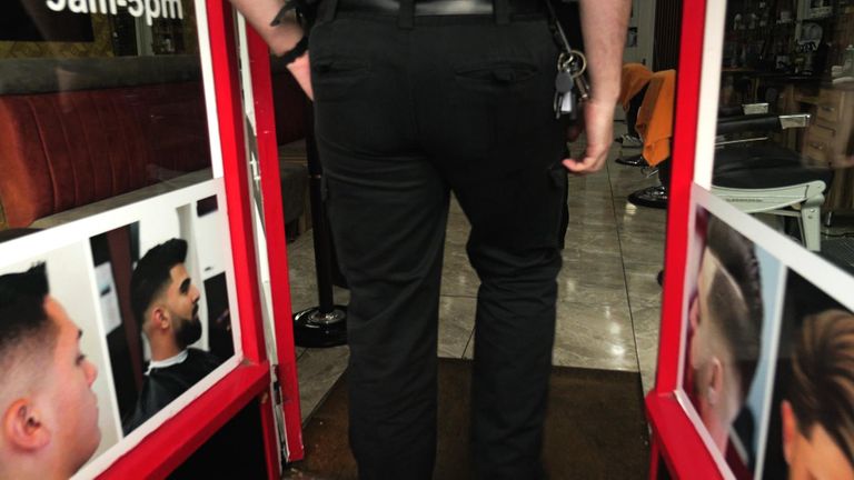 It’s clean and brightly painted, the local football team’s shirt displayed on one wall. Two young men, awaiting customers, hair and beards immaculate, tell officers they commute to work here from London.
