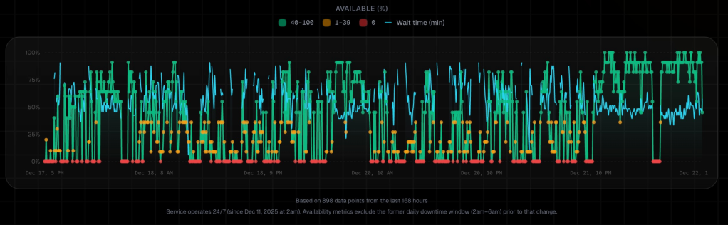 I reverse-engineered the robotaxi app and found the APIs to be able to fetch prebook eta estimates from Tesla. I have a server where every 5 minutes I ping Tesla at ~10 points in both service areas, pull the wait time, and store it. If a wait time is offered, I count it as available, if “high service demand” or any other type of error is shown, it is marked as unavailable.