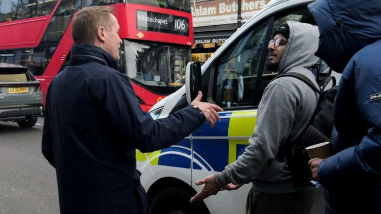 Image: Police moved in to handcuff him and used their phones to check an image of the wanted man from one of Sky News’ online platforms