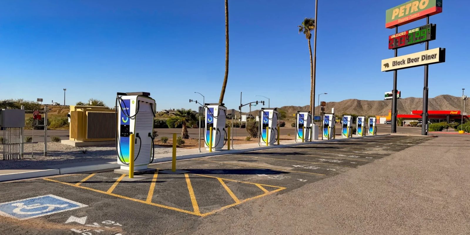 In Arizona, bp pulse’s first site is now online at the Petro Travel Center in Eloy, just off Interstate 10 at Exit 200 (pictured). The location features 16 charging bays delivering up to 400 kilowatts, with both CCS and NACS connectors available. While charging, drivers can take advantage of the travel center’s onsite diner, convenience store, ATM, barber shop, and restrooms.